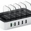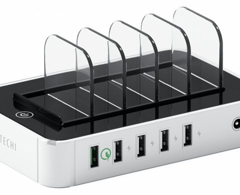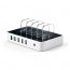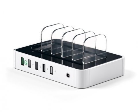 Все порты оснащены надёжной защитой (смарт-чипсет), гарантирующие быструю и безопасную зарядку. При возникновении каких-либо проблем в сети, док-станция автоматически отключается. Зарядное устройство имеет пять прозрачных пластиковых разделителей, которые компактно организовывают размещение всех гаджетов во время зарядки. Благодаря компактным размерам и белому цвету док-станция не займёт много места на компьютерном столе и не нарушит его композицию.