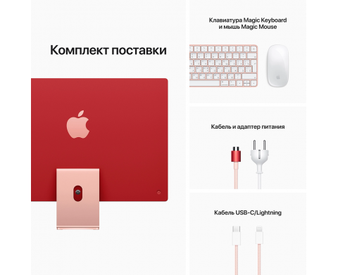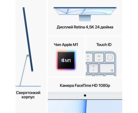 Такой невероятный дизайн стал возможным благодаря чипу M1 — первой системе на чипе, созданной для Mac. Тонкий и лёгкий, этот iMac поместится где угодно. Чип M1 объединяет в себе центральный и графический процессоры, память и ряд других компонентов. Поэтому нам удалось поместить такую мощь в такой тонкий корпус. На превосходном дисплее Retina 24 дюйма с разрешением 4,5K всё видно чётко, и вы сможете рассмотреть каждую деталь.2 Широкий цветовой охват P3 обеспечивает реалистичную передачу изображения с помощью более миллиарда цветов. Яркость дисплея составляет 500 кд/м², поэтому картинка получается очень насыщенной. При этом специальное антибликовое покрытие уменьшает нагрузку на глаза, а технология True Tone автоматически настраивает цветовую температуру в соответствии с окружающим освещением, делая изображение ещё более естественным. Фотографии, презентации, фильмы и сериалы — на iMac всё выглядит превосходно. Улыбнитесь, вас снимает камера FaceTime HD 1080p. Это лучшая камера для Mac. Она обеспечивает в два раза более высокое разрешение во время видеозвонков.3 Увеличенная матрица улавливает больше света. Передовой процессор обработки сигнала изображения в чипе M1 существенно повышает качество изображения. Теперь, обсуждая рабочие моменты или общаясь с друзьями по видеосвязи, вы можете быть уверены, что выглядите потрясающе.
