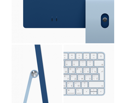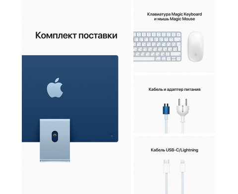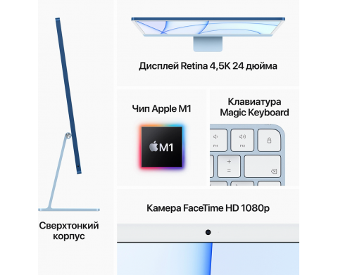 Такой невероятный дизайн стал возможным благодаря чипу M1 — первой системе на чипе, созданной для Mac. Тонкий и лёгкий, этот iMac поместится где угодно. Чип M1 объединяет в себе центральный и графический процессоры, память и ряд других компонентов. Поэтому нам удалось поместить такую мощь в такой тонкий корпус. На превосходном дисплее Retina 24 дюйма с разрешением 4,5K всё видно чётко, и вы сможете рассмотреть каждую деталь.2 Широкий цветовой охват P3 обеспечивает реалистичную передачу изображения с помощью более миллиарда цветов. Яркость дисплея составляет 500 кд/м², поэтому картинка получается очень насыщенной. При этом специальное антибликовое покрытие уменьшает нагрузку на глаза, а технология True Tone автоматически настраивает цветовую температуру в соответствии с окружающим освещением, делая изображение ещё более естественным. Фотографии, презентации, фильмы и сериалы — на iMac всё выглядит превосходно. Улыбнитесь, вас снимает камера FaceTime HD 1080p. Это лучшая камера для Mac. Она обеспечивает в два раза более высокое разрешение во время видеозвонков.3 Увеличенная матрица улавливает больше света. Передовой процессор обработки сигнала изображения в чипе M1 существенно повышает качество изображения. Теперь, обсуждая рабочие моменты или общаясь с друзьями по видеосвязи, вы можете быть уверены, что выглядите потрясающе.