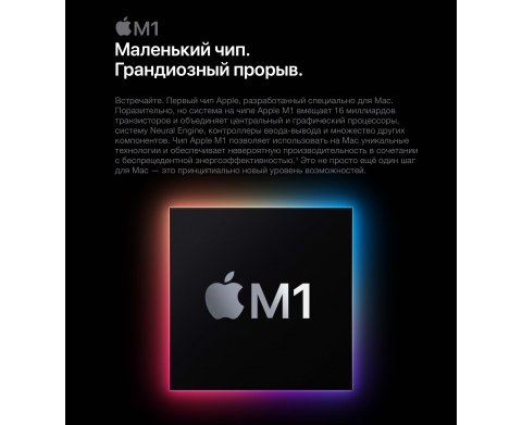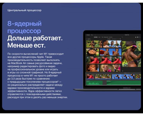С появлением чипа Apple M1 наш самый тонкий и лёгкий ноутбук полностью преобразился. Центральный процессор теперь работает до 3,5 раза быстрее. Графический — до 5 раз. А благодаря нашей передовой системе Neural Engine скорость машинного обучения возросла до 9 раз. Новый MacBook Air работает без подзарядки дольше, чем предыдущие модели. И совсем не шумит, потому что у него нет вентилятора. Мощность ещё никогда не была такой компактной.