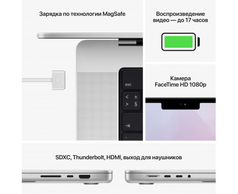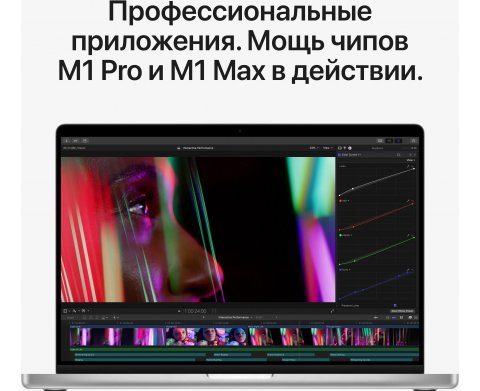 Супербыстрые M1 Pro и M1 Max — первые чипы Apple, разработанные специально для профессионалов. Они дают феноменальную производительность и обеспечивают удивительно долгое время работы без подзарядки. Прибавьте к этому потрясающий дисплей Liquid Retina XDR, превосходную камеру и звук, а также больше портов для профессиональной работы. С этим ноутбуком всё становится возможным. Чипы M1 Pro и M1 Max — это совершенно новый масштаб архитектуры М1. И впервые мы разработали систему на чипе специально для профессиональных ноутбуков. У обоих чипов больше ядер в центральном и графическом процессорах и больше объединённой памяти, чем в чипе M1. А ещё мощная система Neural Engine для высокой скорости машинного обучения и обновлённые медиапроцессоры с поддержкой ProRes. M1 Pro и M1 Max позволяют профессионалам создавать то, что раньше казалось невозможным. Неукротимая мощь и невероятное время работы от аккумулятора — вот она, настоящая магия чипов Apple. С ними вы можете скомпилировать до четырёх раз больше кода в Xcode и до двух раз дольше заниматься обработкой изображений в Lightroom Classic20, прежде чем аккумулятор разрядится полностью. Причём MacBook Pro сохраняет высокий уровень производительности, даже если выключить его из розетки.