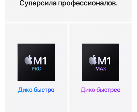 Супербыстрые M1 Pro и M1 Max — первые чипы Apple, разработанные специально для профессионалов. Они дают феноменальную производительность и обеспечивают удивительно долгое время работы без подзарядки. Прибавьте к этому потрясающий дисплей Liquid Retina XDR, превосходную камеру и звук, а также больше портов для профессиональной работы. С этим ноутбуком всё становится возможным. Чипы M1 Pro и M1 Max — это совершенно новый масштаб архитектуры М1. И впервые мы разработали систему на чипе специально для профессиональных ноутбуков. У обоих чипов больше ядер в центральном и графическом процессорах и больше объединённой памяти, чем в чипе M1. А ещё мощная система Neural Engine для высокой скорости машинного обучения и обновлённые медиапроцессоры с поддержкой ProRes. M1 Pro и M1 Max позволяют профессионалам создавать то, что раньше казалось невозможным. Неукротимая мощь и невероятное время работы от аккумулятора — вот она, настоящая магия чипов Apple. С ними вы можете скомпилировать до четырёх раз больше кода в Xcode и до двух раз дольше заниматься обработкой изображений в Lightroom Classic20, прежде чем аккумулятор разрядится полностью. Причём MacBook Pro сохраняет высокий уровень производительности, даже если выключить его из розетки.