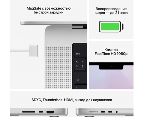 Одновременная поддержка полного штатного разрешения на встроенном дисплее с миллиардом цветов. Дополнительно можно подключить: До двух мониторов с разрешением до 6K, высоким качеством цветопередачи (более миллиарда цветов) и частотой 60 Гц (для моделей с чипом M1 Pro) или Цифровой видеовыход Thunderbolt 4 Штатный видеовывод по стандарту DisplayPort через интерфейс USB‑C Цифровой видеовыход HDMI Поддержка одного монитора с разрешением до 4K и частотой 60 Гц |