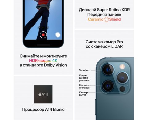 Apple iOS, экран 6.7" Super Retina XDR (2778×1284), Apple A14 Bionic, ОЗУ 6 ГБ, флэш-память 512 ГБ, камера 12 Мп, поддержка двух SIM-карт (nano-SIM и eSIM)