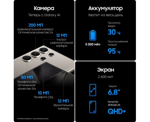 | Характеристики камеры | 200 Мп, f/1.7, 24мм, 85˚, 1/1.3", 0.6мкм, оптическая стабилизация, широкоугольный 50 Мп, f/3.4, 111мм, 22˚, 5x оптический зум, оптическая стабилизация, перископический телеобъектив 10 Мп, f/2.2, 67мм, 36˚, 1/3.52", 1.12мкм, 3x оптический зум, оптическая стабилизация, телеобъектив 12 Мп, f/2.2, 13мм, 120˚, 1/2.55", 1.4мкм, сверхширокоугольный |