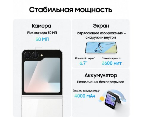 Android, экран 6.7" AMOLED (1080x2640) 120 Гц, Samsung Exynos 2400, ОЗУ 8 ГБ, память 128 ГБ, камера 50 Мп, аккумулятор 4000 мАч, со складным экраном (flip), влагозащита IP48.