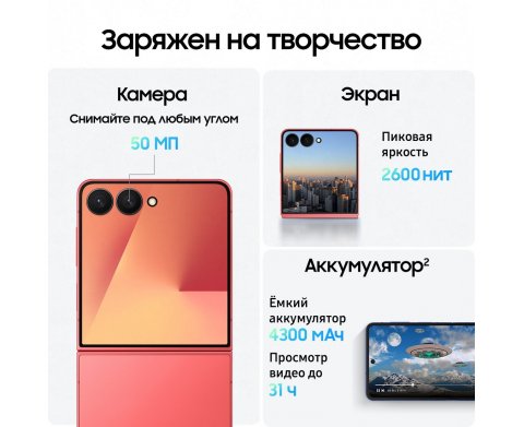 Android, экран 6.9" AMOLED (1080x2520) 120 Гц, Samsung Exynos 2500, ОЗУ 12 ГБ, память 256 ГБ, камера 50 Мп, аккумулятор 4300 мАч, со складным экраном (flip), влагозащита IP48