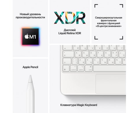 iPad Pro c чипом M1 — самый быстрый iPad. Он разработан таким образом, чтобы уникальные технологии в чипе M1 — например, передовой процессор обработки сигнала и архитектура объединённой памяти — полностью раскрыли свой потенциал. А благодаря энерго­эф­фек­тив­ности M1 тонкий и лёгкий iPad Pro может работать без подзарядки целый день — это удивительное сочетание мощности и компактности. Дисплей Liquid Retina XDR с контрастностью 1 000 000:1 передаёт каждую деталь с невероятной реалистичностью. Он отлично подойдёт для работы с фото и видео HDR или просмотра любимых фильмов и сериалов. Дисплей достигает яркости 1000 кд/м² на всей площади экрана и 1600 кд/м² в пиковом режиме — и поддерживает самые передовые технологии, такие как широкий цветовой охват (P3), True Tone и ProMotion. У iPad Pro новая сверхширо­ко­угольная камера с матрицей 12 Мп и углом обзора 122 градуса. Она поддерживает новую функцию «В центре внимания» и идеально подходит для звонков по FaceTime. С её помощью можно снимать выразительные селфи в портретном режиме, а также использовать технологии TrueDepth и Face ID для безопасной разблокировки iPad Pro.