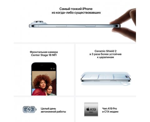 iPhone Air — самый тонкий iPhone: 5,6 мм и 165 г, 6,5″ Super Retina XDR 120 Гц, титан и Ceramic Shield 2, камера 48 МП + 18 МП Center Stage, чип A19 Pro, 5G/Wi-Fi 7, Dual eSIM, MagSafe/Qi2, до 27 ч видео.