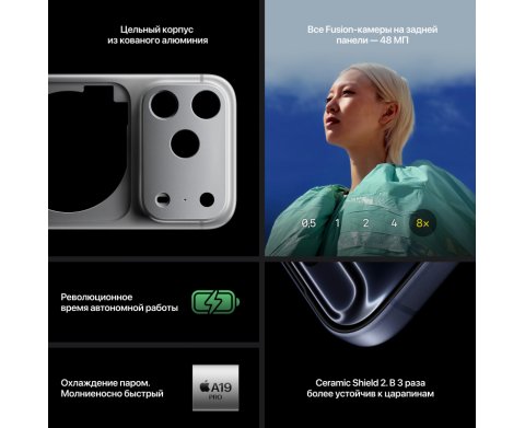 Самый «дальнозоркий» и автономный iPhone в линейке: 6,9″ ProMotion-дисплей, новый A19 Pro с паровой камерой охлаждения, и три 48-МП камеры с тетрапризмой дают «оптического качества» зум до 8× (экв. до 200 мм) и широкий диапазон фокусных (16×). Передняя 18-МП Center Stage прокачала селфи и видео, а Ceramic Shield 2 спереди + Ceramic Shield сзади делают корпус заметно устойчивее к царапинам и ударам. Есть Action Button и отдельная кнопка Camera Control, Wi-Fi 7, USB-C с USB 3 (до 10 Гбит/с) и самая длинная заявленная работа от батареи в серии.