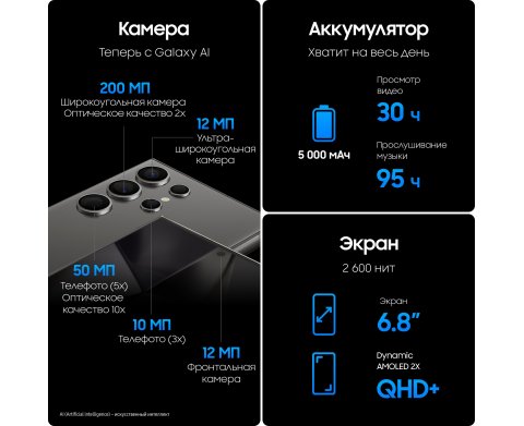 | Характеристики камеры | 200 Мп, f/1.7, 24мм, 85˚, 1/1.3", 0.6мкм, оптическая стабилизация, широкоугольный 50 Мп, f/3.4, 111мм, 22˚, 5x оптический зум, оптическая стабилизация, перископический телеобъектив 10 Мп, f/2.2, 67мм, 36˚, 1/3.52", 1.12мкм, 3x оптический зум, оптическая стабилизация, телеобъектив 12 Мп, f/2.2, 13мм, 120˚, 1/2.55", 1.4мкм, сверхширокоугольный |