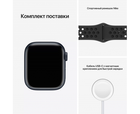 Спецификация Apple Watch Nike Series 7, 41 мм, корпус из алюминия цвета «тёмная ночь», спортивный ремешок Nike цвета «антрацитовый/чёрный» (MKN43)