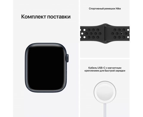 Спецификация Apple Watch Nike Series 7, 45 мм, корпус из алюминия цвета «тёмная ночь», спортивный ремешок Nike цвета «антрацитовый/чёрный» (MKNC3)