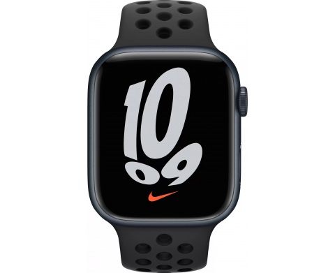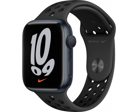 Apple Watch Nike Series 7, 45 мм, корпус из алюминия цвета «тёмная ночь», спортивный ремешок Nike цвета «антрацитовый/чёрный» (MKNC3)